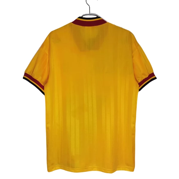 Das Arsenal Retro Auswärtstrikot 1993-94 zeigt einen auffälligen Auswärtslook in Gelb mit schwarzen und roten Kontrasten. Die kräftige Grundfarbe wird durch markante schräge schwarze Streifen auf der Vorderseite klar geprägt und sorgt für einen unverwechselbaren 90er-Stil. Der V-Kragen mit roten und schwarzen Details rundet das Design sportlich ab und verstärkt den dynamischen Gesamteindruck.