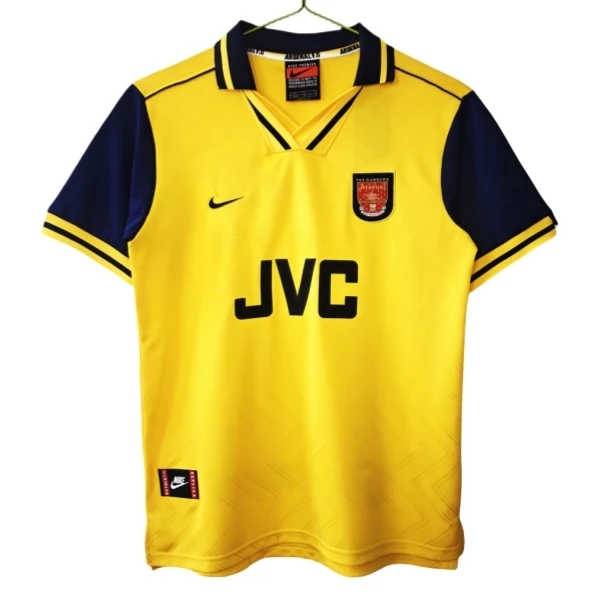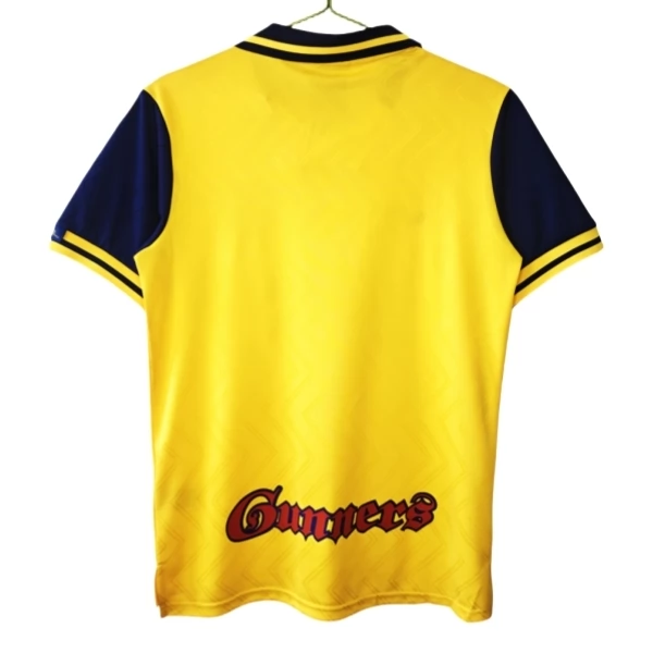 Das Arsenal Retro Auswärtstrikot 1996-97 zeigt einen auffälligen Auswärtslook in Gelb mit schwarzen Kontrasten. Die helle Grundfarbe sorgt für einen markanten Auftritt, während dunkle Ärmel und der kontrastreiche Kragen dem Design klare Konturen verleihen. Die insgesamt reduzierte Gestaltung unterstreicht den typischen Stil der späten 90er-Jahre.