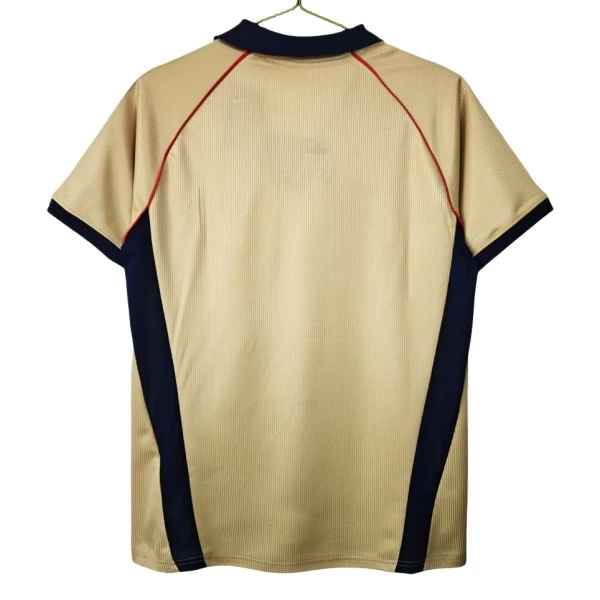Das Arsenal Retro Auswärtstrikot 2001-02 setzt auf einen eleganten Auswärtslook in Gold mit schwarzen und roten Kontrasten. Die helle Grundfarbe verleiht dem Design eine besondere Ausstrahlung, während der schwarze Polokragen und die dunklen Seiteneinsätze für klare Konturen sorgen. Rote Linien im Schulterbereich ergänzen den Look und geben dem Modell zusätzliche Dynamik.