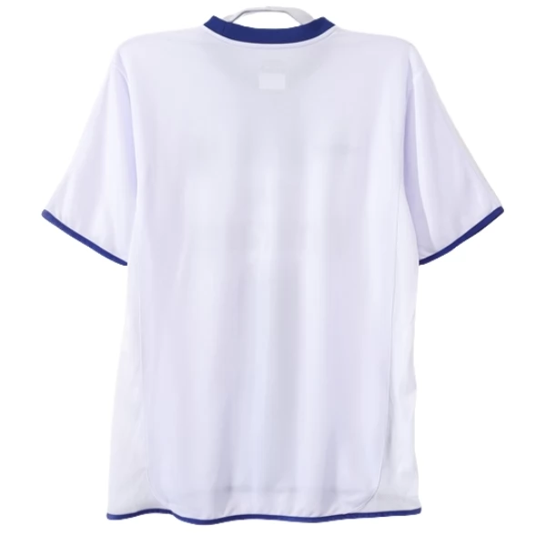 Das Chelsea Retro Auswärtstrikot 2003-05 zeigt einen markanten Auswärtslook in Weiß mit blauen und schwarzen Kontrasten. Die helle Grundfarbe sorgt für einen klaren und frischen Auftritt, während der zentrale vertikale Streifen auf der Vorderseite das Design deutlich prägt. Blaue Abschlüsse an Kragen, Ärmeln und Saum runden den Look harmonisch ab und unterstreichen den Stil dieser Saison.