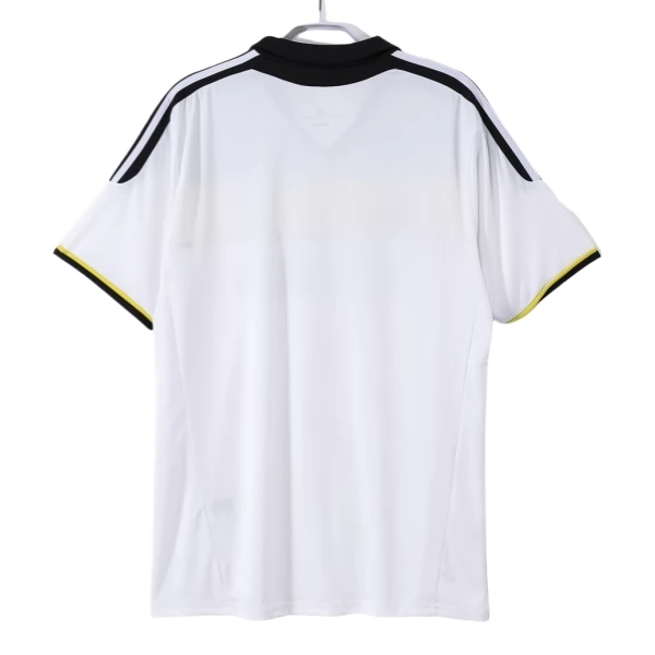 Das Chelsea Retro Ausweichtrikot 2011-12 zeigt einen auffälligen Look in Weiß mit schwarzen und gelben Kontrasten. Die helle Grundfarbe sorgt für einen klaren Auftritt, während der breite gelbe Querstreifen auf der Brust dem Design eine markante Struktur verleiht. Schwarze Details an Kragen, Schultern und Ärmeln setzen zusätzliche Akzente und runden das Gesamtbild sportlich ab.