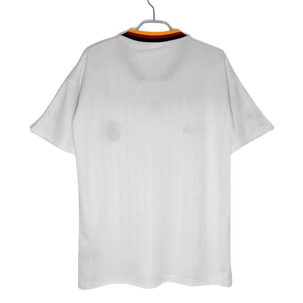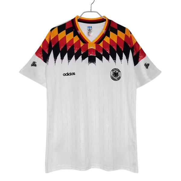 Das Deutschland Retro Trikot 1994 gehört zu den auffälligsten Heim-Looks dieser Zeit. Auf der weißen Basis setzt das markante Muster in Schwarz, Rot und Gold im oberen Bereich sofort ein starkes visuelles Zeichen. So entsteht ein Heimtrikot, das den Stil der 90er mit viel Energie und klarer Wiedererkennbarkeit auf den Punkt bringt.
