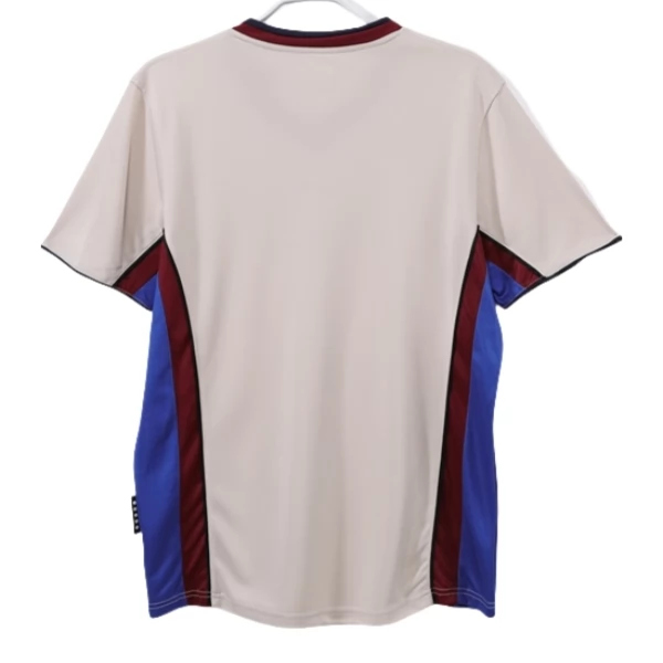Das FC Barcelona Retro Auswärtstrikot 1998-99 zeigt einen klaren Auswärtslook in Beige mit dunklen und blauen Kontrasten an den Seiten. Die helle Grundfarbe sorgt für eine elegante und zugleich ungewöhnliche Wirkung, während die seitlichen Einsätze dem Design zusätzliche Dynamik verleihen. Der V-Kragen mit farblich abgesetztem Abschluss rundet das Gesamtbild sportlich und markant ab.
