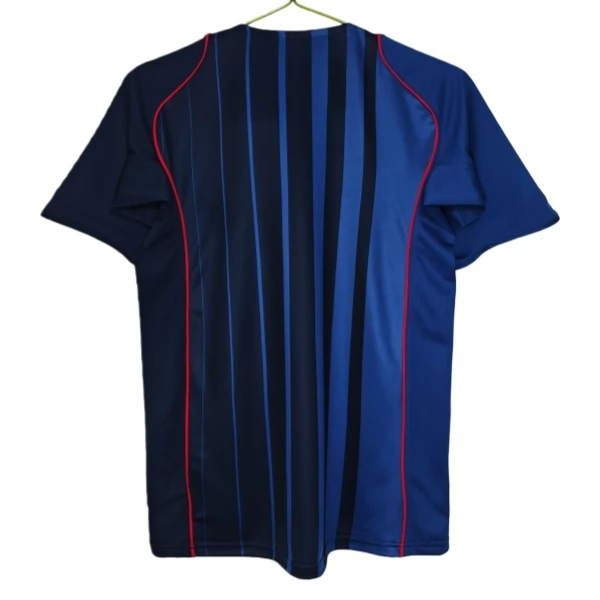 Das FC Barcelona Retro Auswärtstrikot 2004-05 zeigt einen markanten Auswärtslook in Dunkelblau und Blau mit feinen roten Kontrasten. Die dunkle Grundoptik sorgt für einen modernen und zugleich klassischen Auftritt, während die vertikal angeordneten Streifen auf der Vorderseite dem Design zusätzliche Tiefe verleihen. Der Rundkragen fügt sich sauber in das Gesamtbild ein und unterstreicht die klare Linienführung dieser Saison.