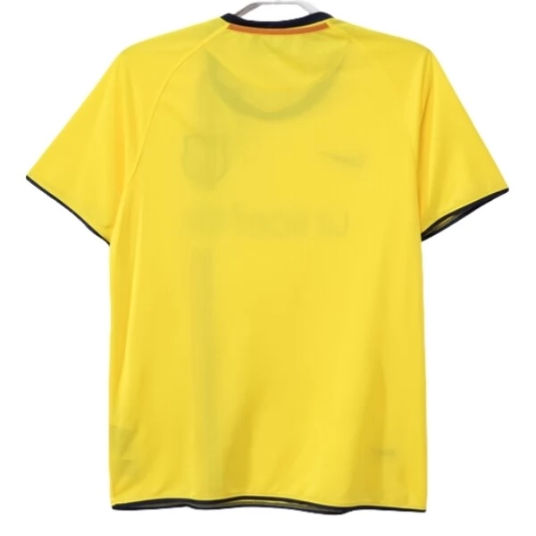 Das FC Barcelona Retro Auswärtstrikot 2008-09 zeigt einen auffälligen Auswärtslook in Gelb mit schwarzen und roten Kontrasten. Die kräftige Grundfarbe sorgt für eine starke visuelle Präsenz, während der vertikale Streifen auf der Vorderseite dem Design eine markante Struktur verleiht. Schwarze Abschlüsse an Kragen und Ärmeln runden das Gesamtbild klar und sportlich ab.