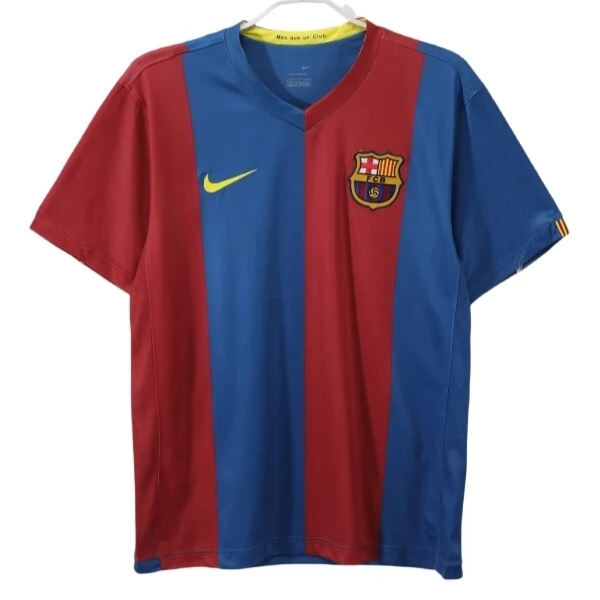 Das FC Barcelona Retro Heimtrikot 2006-07 zeigt einen klassischen Heimlook in Blau und Rot mit breiten vertikalen Streifen auf der Vorderseite. Die kräftige Farbkombination sorgt für einen traditionsreichen und sofort erkennbaren Auftritt, während gelbe Details sichtbare Kontraste setzen. Der asymmetrisch wirkende Kragen verleiht dem Design eine besondere Note und unterstreicht den markanten Stil dieser Saison.