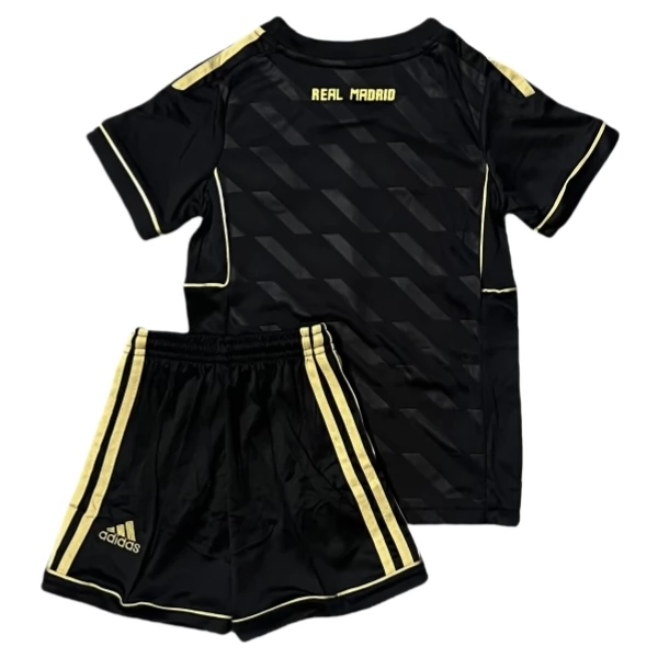 Dieses Real Madrid Retro trikot Set für Kinder greift den Auswärts-Look der Saison 2011/12 auf, einer Spielzeit, in der schwarze Grundfarben mit goldenen Details kombiniert wurden. Gerade diese Farbkombination sorgt für einen markanten und sofort wiedererkennbaren Auftritt, der sich klar von klassischen Heimdesigns abhebt.