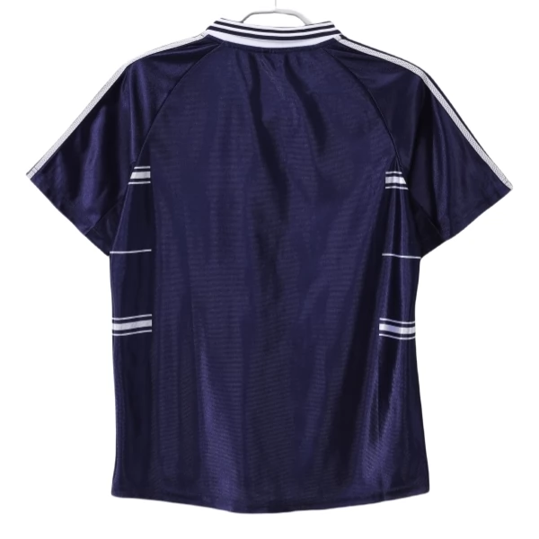 Besonders prägend sind bei dieser Auswärts-Ausführung der gestreifte Kragen, die weißen Schulterstreifen und die horizontalen Linien auf der Vorderseite. Gerade diese Kombination gibt dem Design eine klare Struktur und sorgt für einen Look, der sich deutlich von späteren, reduzierteren Auswärtsmodellen unterscheidet. Wenn du ein Real Madrid Auswärtstrikot suchst, das den Stil der späten 90er direkt aufgreift, ist diese Ausführung besonders passend.