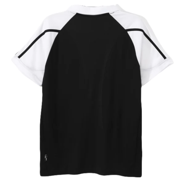 Dieses Real Madrid Retro trikot greift den Auswärts-Look der Saison 2001/02 auf, einer Phase, in der dunkle Designs mit klaren Kontrasten und klassischer Linienführung umgesetzt wurden. Die schwarze Grundfarbe sorgt für einen markanten Auftritt, während die weißen Schulterpartien dem Modell genau die klare Optik geben, die viele Fans mit den frühen 2000er Jahren verbinden.