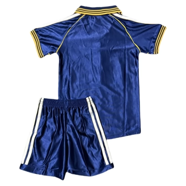 Typisch für diesen Kinder Trikotsatz sind der gestreifte Kragen mit goldenen Akzenten, die weißen Schulterstreifen und die feinen goldenen Linien im oberen Bereich des Oberteils. Ergänzt wird das Set durch eine passende kurze Hose in abgestimmter Farbgebung mit weißen Seitenstreifen. So ergeben Trikot und Hose zusammen einen vollständigen und stimmigen Ausweich-Look, der den Stil dieser Zeit klar aufgreift.