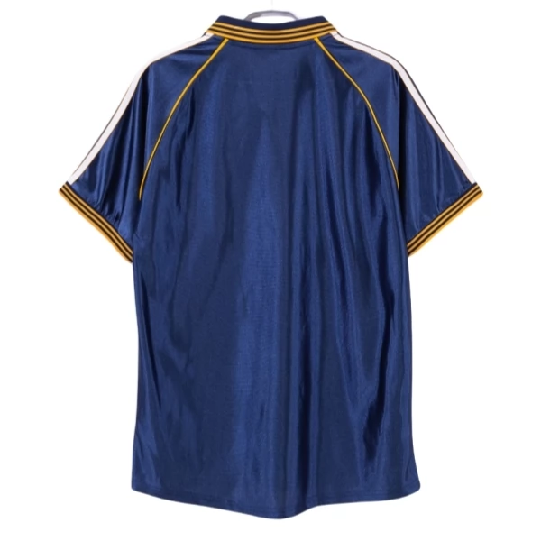 Typisch für diese Ausweich-Ausführung sind der gestreifte Kragen mit goldenen Akzenten, die weißen Schulterstreifen und die feinen goldenen Linien im oberen Bereich. Gerade diese Kombination verleiht dem Modell einen klaren späten 90er-Look, der sich deutlich von moderneren, reduzierteren Varianten unterscheidet. Wenn du ein Real Madrid Ausweichtrikot suchst, das den Stil dieser Zeit unmittelbar aufgreift, ist diese Ausführung besonders passend.