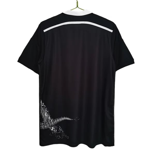 Dieses Real Madrid Retro trikot greift den Ausweich-Look der Saison 2014/15 auf, einer Spielzeit, in der dunkle Grundfarben mit auffälligen grafischen Motiven kombiniert wurden. Die schwarze Basis verleiht dem Modell einen markanten Auftritt, während das große helle Motiv auf der Vorderseite sofort für einen eigenständigen und ungewöhnlichen Look sorgt.