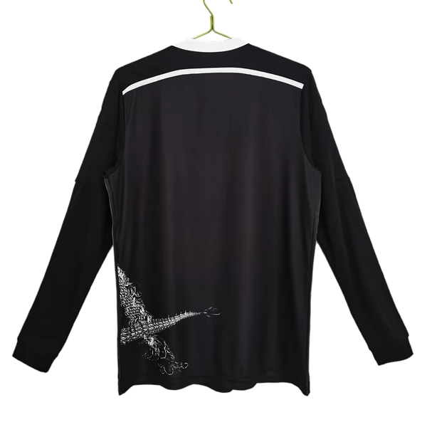 Dieses Real Madrid Retro trikot Langarm greift den Ausweich-Look der Saison 2014/15 auf, einer Spielzeit, in der dunkle Grundfarben mit auffälligen grafischen Motiven kombiniert wurden. Gerade in der Langarm-Version wirkt das schwarze Design noch geschlossener und verstärkt den markanten, eigenständigen Charakter dieses Modells zusätzlich.