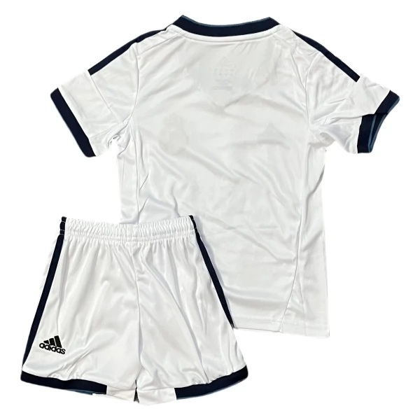 Typisch für diesen Kinder Trikotsatz sind der schwarze V-Ausschnitt, die schwarzen Schulterstreifen und die schwarzen Ärmelabschlüsse am Oberteil. Dazu kommt die passende kurze Hose mit abgestimmten schwarzen Seitenstreifen und schwarzem Beinabschluss, sodass Trikot und Hose zusammen einen vollständigen und stimmigen Heim-Look ergeben. Wenn du ein Real Madrid Kinder Set suchst, das den Stil dieser Saison klar aufgreift und sportlich wirkt, ist diese Ausführung besonders passend.