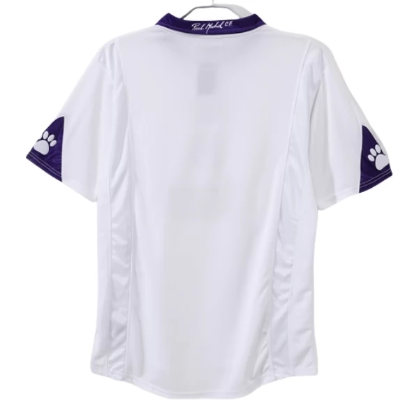 Typisch für diese Heim-Ausführung sind der Polokragen mit violettem Farbverlauf, die violetten Abschlüsse an den Ärmeln und die insgesamt sehr klare Front. Gerade die Verbindung aus weißer Basis und violetten Akzenten sorgt für einen eleganten, aber dennoch markanten Look, der sich deutlich von späteren Heimdesigns unterscheidet. Wenn du ein Real Madrid Heimtrikot suchst, das den Stil dieser Ära direkt aufgreift, ist diese Ausführung besonders passend.