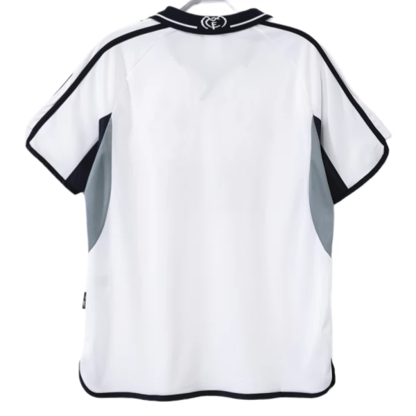 Auffällig sind bei dieser Heim-Ausführung vor allem der dunkle Polokragen, die schwarzen Schulterlinien und die grauen Flächen an den Seiten. Diese Kombination verleiht dem Design eine sportliche, fast technische Optik, wie sie für diese Zeit sehr typisch war. Gerade wenn du ein Real Madrid Heimtrikot suchst, das sich sichtbar von späteren, reduzierteren Jahren unterscheidet, bietet dieses Modell einen klaren Bezug zur Ära um die Jahrtausendwende.