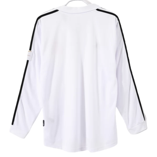 Dieses Real Madrid Retro trikot Langarm greift den Heim-Look der Saison 2002/03 auf, einer Phase, in der das klassische Weiß mit schwarzen Details besonders klar und traditionell umgesetzt wurde. Gerade in der Langarm-Version kommt dieser reduzierte Stil noch deutlicher zur Geltung und erinnert an den typischen Auftritt der frühen 2000er.