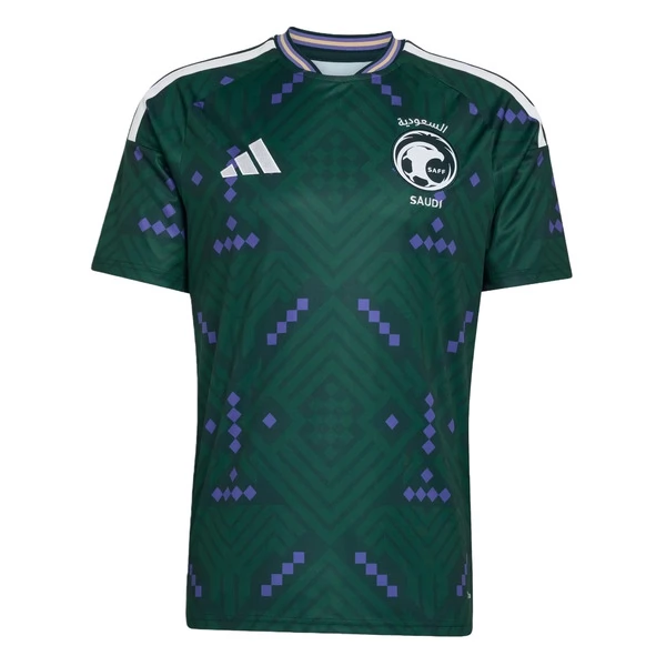 Das Saudi-Arabien Heimtrikot zur WM 2026 setzt auf eine dunkelgrüne Basis mit geometrischen Mustern und auffälligen violetten Akzenten. Die klare Farbwirkung sorgt für einen eigenständigen Heim-Look, während die grafische Gestaltung dem Design zusätzliche Tiefe verleiht. So entsteht ein Trikot, das modern wirkt und sich deutlich von schlichteren Heimtrikots abhebt.