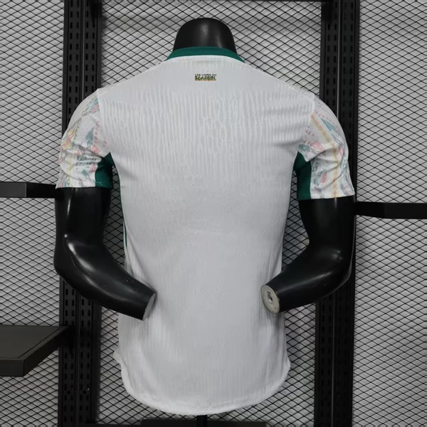 Das Senegal Heimtrikot zur WM 2026 zeigt eine weiße Basis mit mehrfarbigen Mustern, die an dekorative und kulturell inspirierte Elemente erinnern. Dadurch wirkt das Design besonders lebendig und hebt sich klar von schlichteren Heimtrikots ab. Grüne Kontraste an Kragen und Seiten runden den Look markant ab.